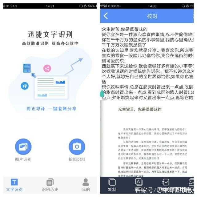 下面这个文字识别工具也是手机上的,也比较实用,打开软件后,它上面有两种文字识别的功能,既能识别手机里的图片,也能拍照识别文字,而且对识别出来的文字还可以进行翻译,真的是超级方便啊!