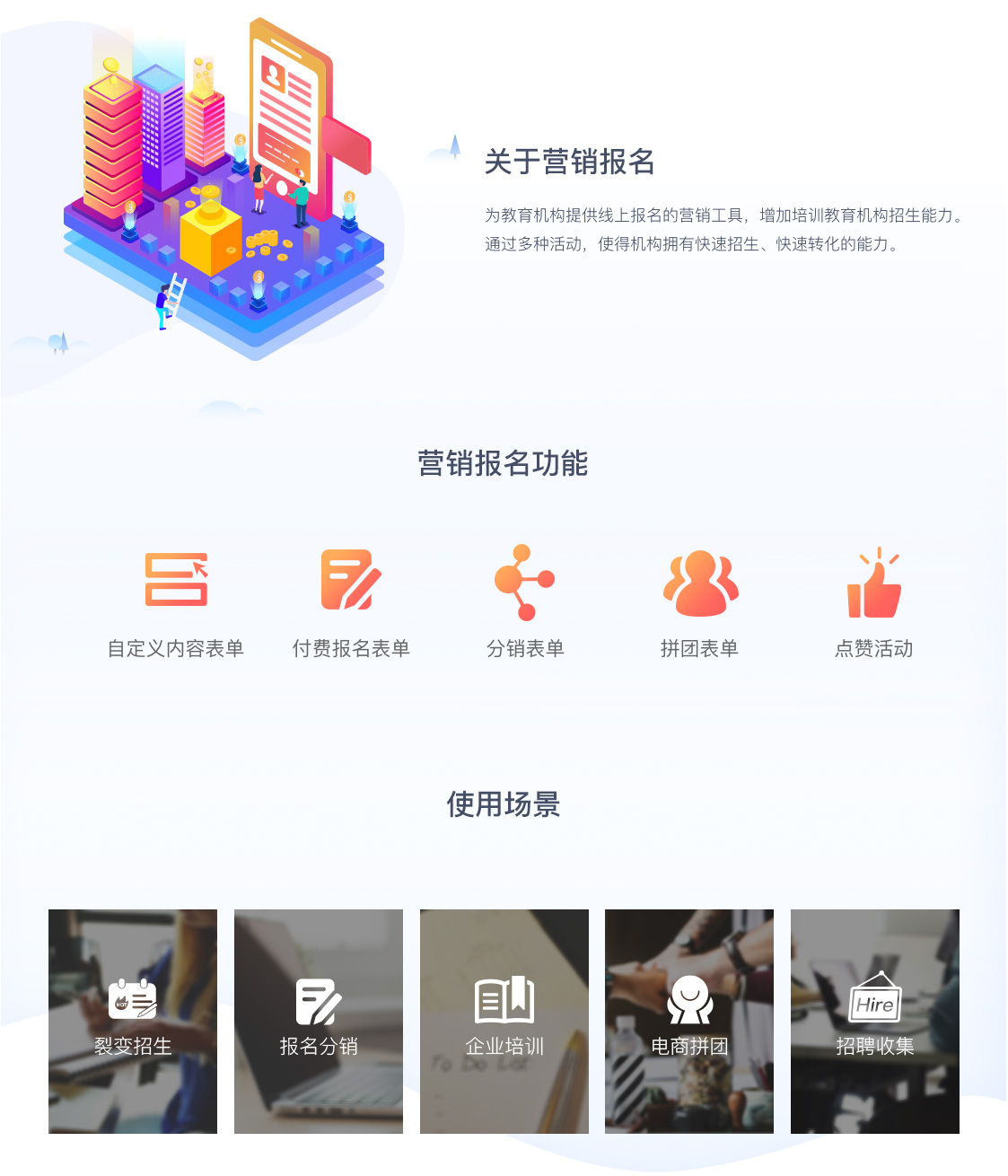 为教育机构提供线上报名的营销工具,增加培训教育机构招生能力。通过多种活动,使得机构拥有快速招生、快速转化的能力。